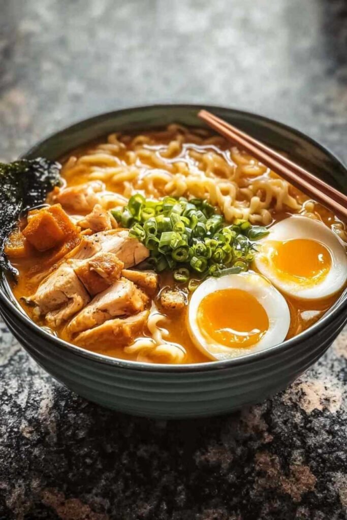 Il y a quelques mois, par une froide soirée d’hiver, j’ai décidé de recréer cette merveille que j’avais goûtée dans un petit restaurant de quartier. Le résultat ? Un bouillon parfumé au miso et à la sauce soja, des nouilles fondantes, du poulet tendre et ces petites garnitures qui font toute la différence. Ce qui rend ce Ramen au Poulet Facile si spécial, c’est sa capacité à réchauffer le cœur tout en restant simple à préparer. En seulement 35 minutes, vous obtenez un plat complet qui rivalise avec les meilleurs restaurants, sans technique compliquée ni ingrédients introuvables. Cette recette vous accompagnera dans vos soirées cocooning comme dans vos dîners en famille. Vous allez adorer cette version !